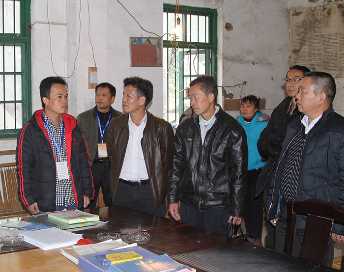 集團(tuán)公司朱堅(jiān)和董事長(左三)、張友坐副書記(右一)聽取駐村”第一書記“梁義寬匯報(bào)工作。 在相堯村、豹山村、才帛村,朱堅(jiān)和董事長分別與當(dāng)?shù)劓?zhèn)、村干部以及覃獻(xiàn)康、梁義寬、蔣博三位派駐農(nóng)村“第一書記”和扶貧工作隊(duì)隊(duì)員進(jìn)行親切交談,詳細(xì)詢問“第一書記”工作、生活情況,并聽取了“第一書記”關(guān)于幫扶村的黨建及村集體經(jīng)濟(jì)發(fā)展情況匯報(bào)。得知目前各駐村書記及扶貧工作隊(duì)員已經(jīng)完成精準(zhǔn)扶貧入戶摸底調(diào)查時(shí),朱堅(jiān)和董事長對“第一書記”到村以來,深入調(diào)查走訪,積極幫助村里理思路、定規(guī)劃、辦實(shí)事,表示充分肯定。