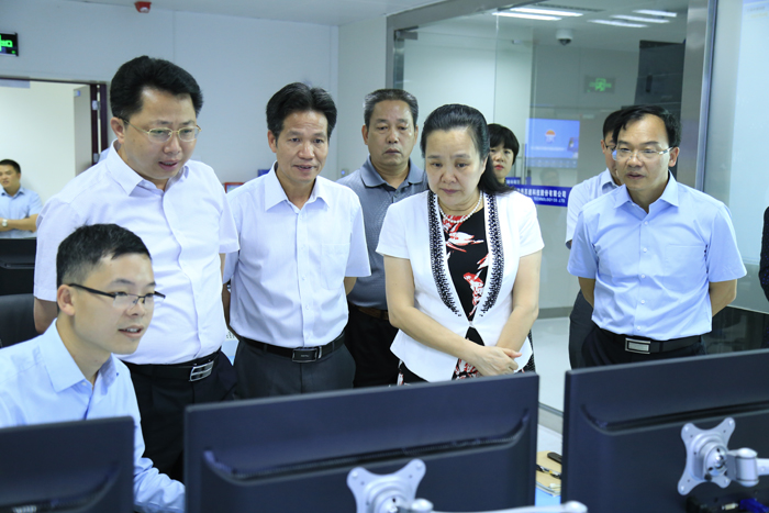黃敏(前右二)一行在廣西ETC數據中心機房調研,朱堅和(左二)、張友坐(左四)、鄧遠志(右一)陪同。