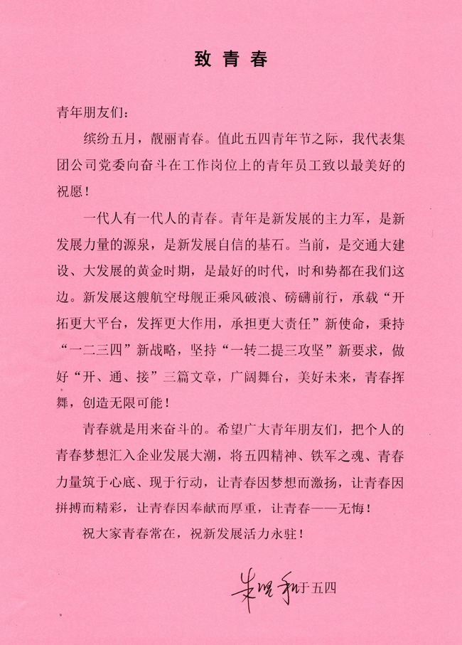 朱堅和書記傳達了習(xí)近平總書記在中國政法大學(xué)的重要講話精神,并宣讀了致青年朋友們的一封信——《致青春》,向奮斗在工作崗位上的廣大青年員工傳達了殷切期望與美好祝愿。信件原文如下: