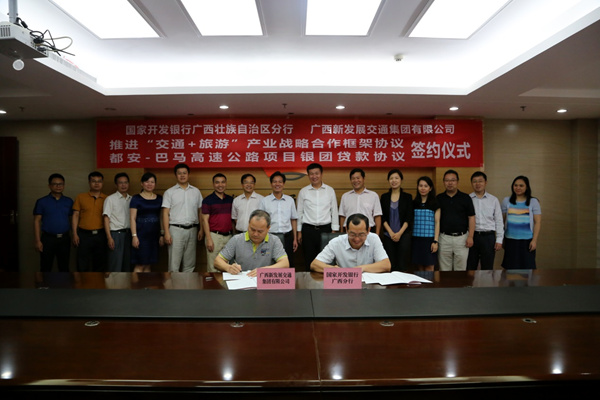 6月9日,集團公司與國家開發銀行廣西分行在南寧簽訂戰略合作框架協議。集團公司黨委書記、董事長朱堅和,黨委副書記、副董事長、總經理唐咸秋,黨委委員、總會計師鄧遠志,國家開發銀行廣西分行黨委書記、行長謝志軍,副行長呂軍等領導出席簽約儀式。簽約前,雙方進行了友好會談,雙方重點圍繞賀州至巴馬高速公路、融水至河池高速公路、國省干線公路及沿線地區的“交通+旅游”項目開展深度戰略合作等方面進行了深入的交流與探討,并達成了一致共識。座談會后,唐咸秋與呂軍分別代表雙方簽訂戰略合作框架協議。雙方有關部門負責人參加簽約儀式。(集團公司 投資改革發展部)