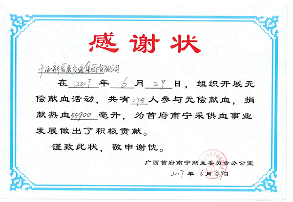 南寧獻血管理委員會充分肯定了新發展交通集團黨員群眾踴躍參與獻血,積極投身公益事業的行為,并向集團公司贈送了感謝狀。