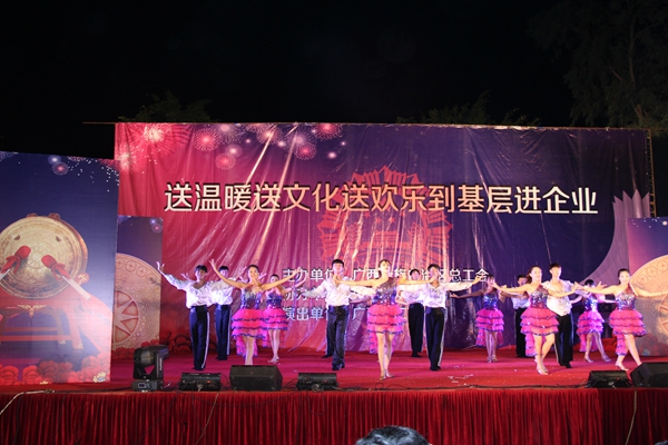晚上,自治區(qū)總工會(huì)安排了豐富多彩的慰問(wèn)演出。整場(chǎng)演出以“勞動(dòng)托起中國(guó)夢(mèng)”為主題,載歌載舞,奏響勞動(dòng)光榮的時(shí)代主旋律。慰問(wèn)演出在富有壯族文化風(fēng)情的《廣西尼的呀》的舞蹈中拉開(kāi)了序幕,既有《力與美》的高難度雜技表演,又有詼諧幽默、勵(lì)志感人的小品《為愛(ài)加油》,配樂(lè)詩(shī)朗誦《心儀廣西》展示了廣西壯鄉(xiāng)的山好水好前景闊,更有優(yōu)美的舞蹈《魅影》、《工匠精神》等節(jié)目更是歌頌了勞動(dòng)之美。路橋集團(tuán)員工還帶來(lái)配樂(lè)詩(shī)朗誦《萬(wàn)里征程品為本,行穩(wěn)致遠(yuǎn)前景闊》和小品《工地愛(ài)情故事》,展現(xiàn)了路橋職工的風(fēng)采。慰問(wèn)演出在歌舞《不忘初心》中畫(huà)上了圓滿的句號(hào),路橋建設(shè)者們?cè)谶@場(chǎng)文化盛宴中度過(guò)一個(gè)難忘的夜晚。