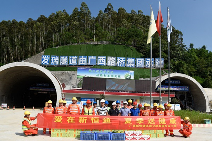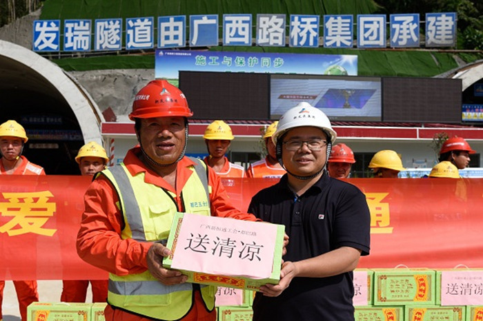 8月14-15日,新恒通公司黨委副書記、副董事長、總經(jīng)理、總工程師藍日彥,公司黨委委員、常務副總經(jīng)理蘇偉勝,公司黨委委員、副總經(jīng)理、都巴高速指揮部黨支部書記、指揮長陸原恩一行到都巴高速五分部發(fā)瑞隧道出口、三分部紅水河特大橋施工現(xiàn)場,深入施工一線慰問都巴高速六個分部的一線工人,為他們送去了防暑降溫慰問品,表達了對一線工人的關懷,感謝他們炎炎夏日下的堅守。
