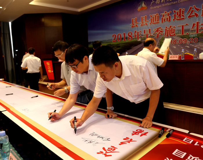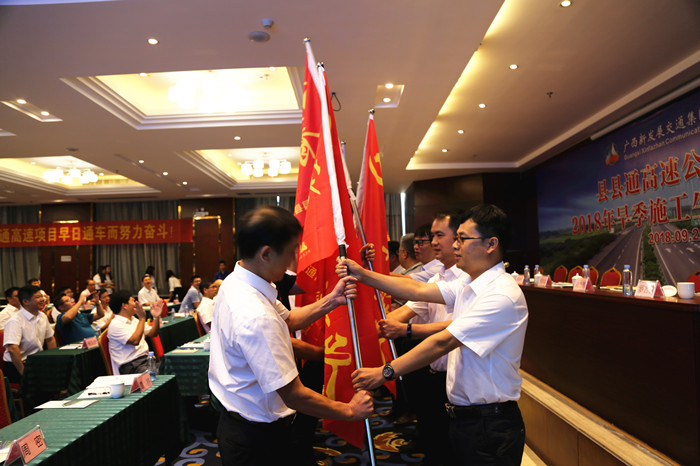 會上,與會領(lǐng)導(dǎo)為各參建單位代表授“黨員先鋒隊”及“青年突擊隊”旗子。會上還開展了旱季施工質(zhì)量安全承諾簽字活動。